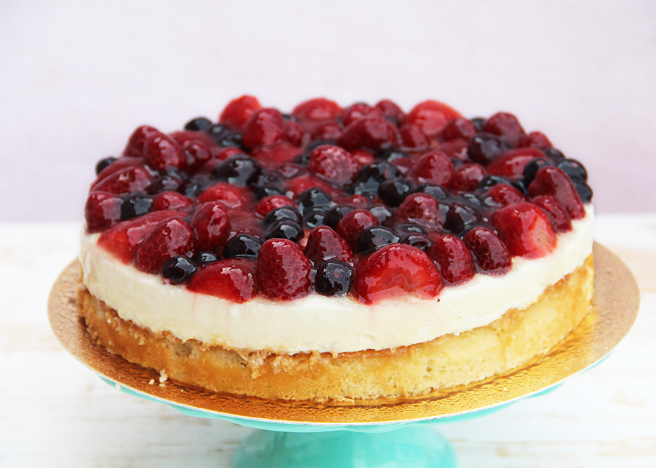 Svetlý korpus plnený tvarohovou plnkou a lesným ovocím.